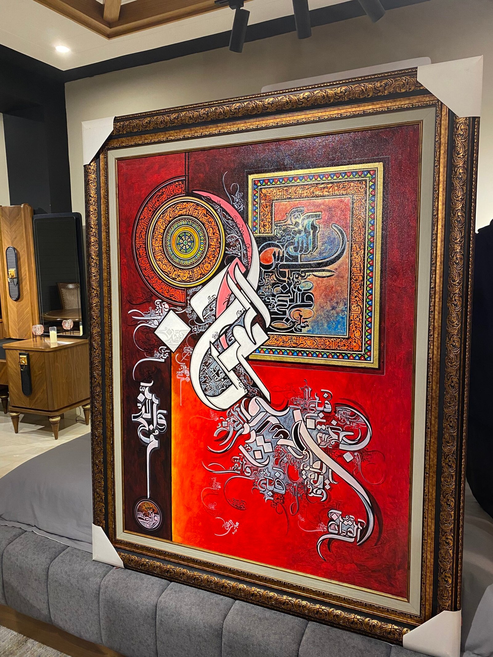 This profound calligraphic painting narrates the life journey of Prophet Muhammad ﷺ through symbolism, color, and divine…